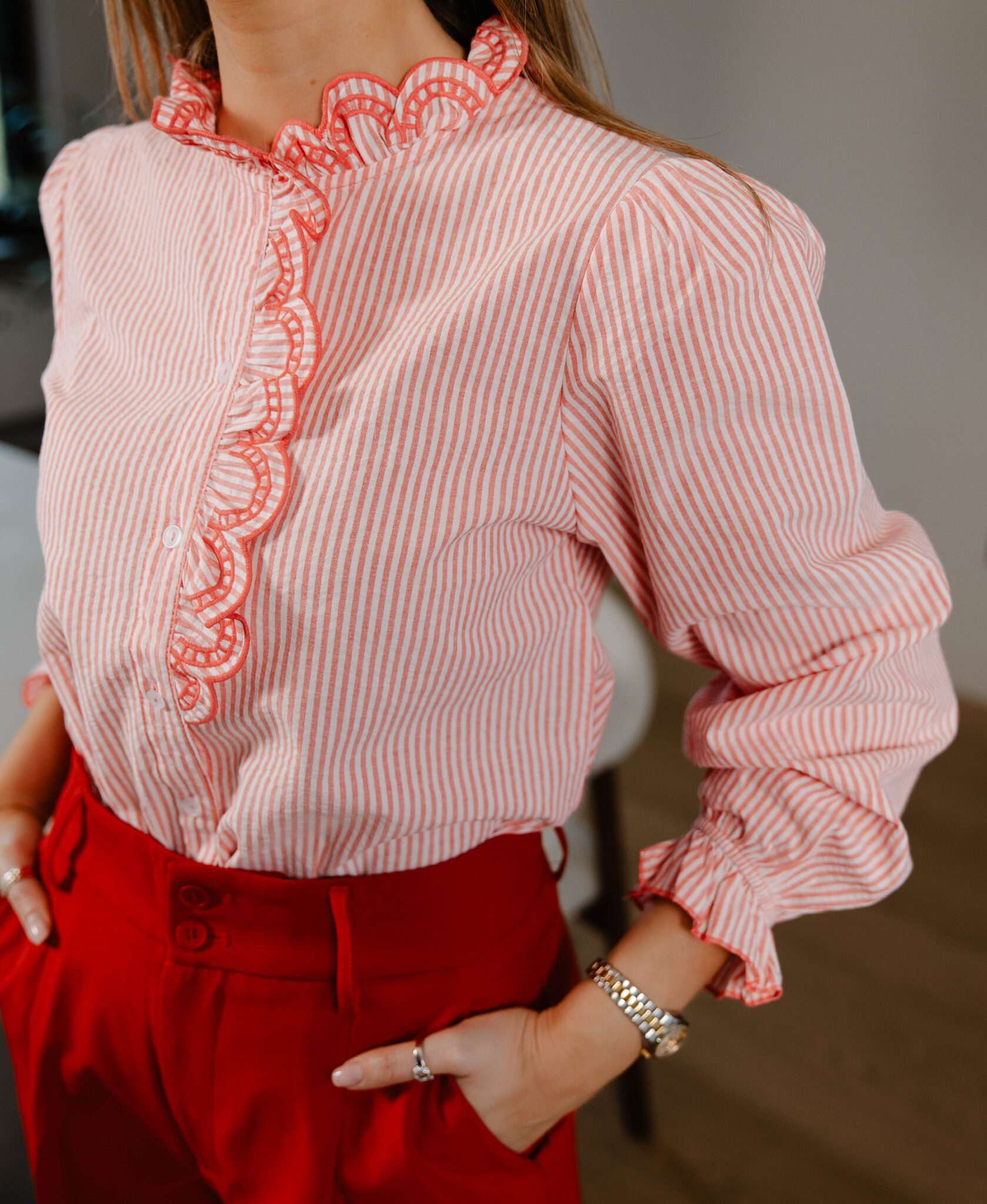 Pre-orderAan verlanglijst toevoegenFleur blouse met ruffle – Red €44,95 Incl. btw Op voorraad S M LSize: *SMLToevoegen aan winkelwagenInloggen voor wishlistDirect betalen Expected time of deliveryGratis verzending Vanaf €150,-BeschrijvingBlouse Kleur : Rood Maat : Valt op maat Justine meet 1m73 en draagt maat S